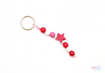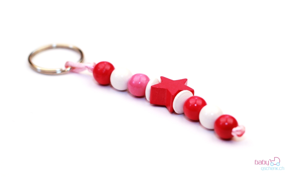 Aussenrum ist die Verzierung in weissen Linsen und rosa sowie roten Perlen. Zusätzlich kann der Anhänger mit einem Namen bestückt werden.